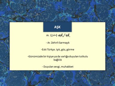 Aşk kelimesi, yaygın bir kabule göre Arapça’da “aşekâ/sarmaştı, sıkıca sarıldı” kelimesinin mastarıdır ve “sarmaşık” anlamına gelmektedir. Bazı kaynaklar bu sarmaşığın “zehirli” olduğunu söylemişler. ...