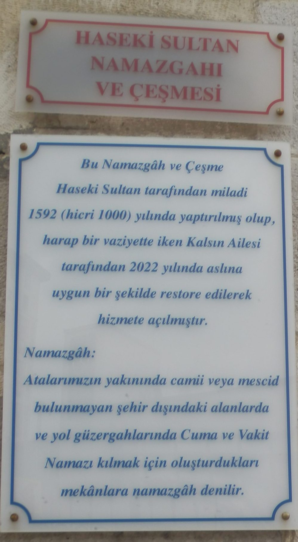 “Haseki Sultan Namazgâh ve Çeşmesi – Bu namazgâh ve çeşme Haseki Sultan tarafından miladi 1592 (hicri 1000) yılında yaptırılmış olup, harap bir vaziyette iken Kalsın Ailesi tarafından 2022 yılında aslına uygun bir şekilde restore edilerek hizmete açılmıştır.