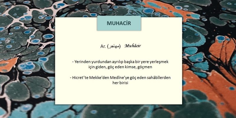 Muhâcir, hicret eden demek. Arapça kökenli bir kelime olup, dilimize değişmeden, “hicret” kelimesinden türeyerek girmiştir. Evinden, yurdundan ayrılan; keyfî sebeplerle değil, mecburen; canını, ırzını, aklını, dinini ve malını korumak için güvenli bir yere göç etmek zorunda kalan kimselere denilmektedir. Efendimiz aleyhisselâtu vesselâmın zorda kalarak hicret etmesi üzerine, Mekke’den O’nunla beraber ayrılıp Medine’ye yerleşen müslümanlara “muhâcir” denilmiş ve sonrasında benzer sebeplerle göç edenler için de aynı ifade kullanılmıştır.