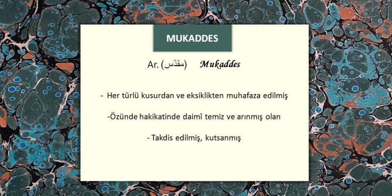 Mukaddes kelimesinin ‘temizlenmiş, arındırılmış ya da el değmemiş temizlikte olan’ anlamlarını ifade ettiğine birçok kaynakta yer verilmiştir. Mukaddes olarak bildiğimiz ve zikrettiğimiz her şey, el-Kuddüs (c.c.) olan Allah (c.c.) tarafından bahşedilmiş, ihsan edilmiş temizliğe, kudsiyete sahiptir. Çünkü var olan her şeyi meydana getiren Allah olduğu cihetle kudsiyetin kaynağı da Allah’tır.