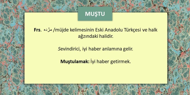 Müjde kelimesi Türkçeye ilk zamanlarda “muştu/muştı” olarak girmişti. Anlam olarak da şimdiki kullanımından biraz farklıydı. Muştu, sevinçli bir haber getiren kişiye verilen bahşiş, armağan anlamında kullanılıyordu. O yüzden bir komşusuna bir yakınına hayırlı güzel haber getiren kimse ilk önce “Müjdemi isterim” diyerek aslında karşısındaki yakını ile arasında tatlı bir iletişimi başlatmış olurdu. Nihayetinde hem müjdelenen kişi sevinir hem de müjde yani hediye alacak kişi sevinirdi. Böylece hediyeleşme güzel bir dostluğa yakınlığa vesile olur, bağlar kuvvetlenirdi.