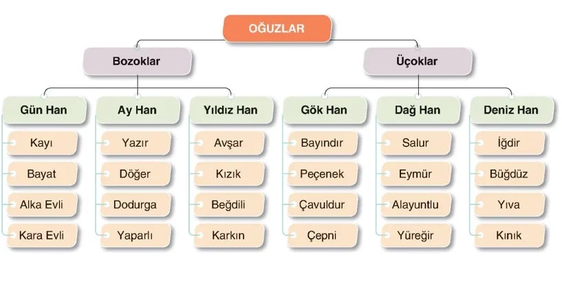 Yukarıdaki kaynaklar da bahsedildiği gibi Türk boylarından olan Oğuzlar; 2 ana kola ayrılmış. Bunlar da kendi içinde 3 boya, onlarda kendi aralarında 4’er boya ayrılmış. Bilinen toplam 24 boy tespit edilmiş. Her boy birbirine yakın yerleşkelerde olmak üzere farklı bölgelere yerleşmiş.